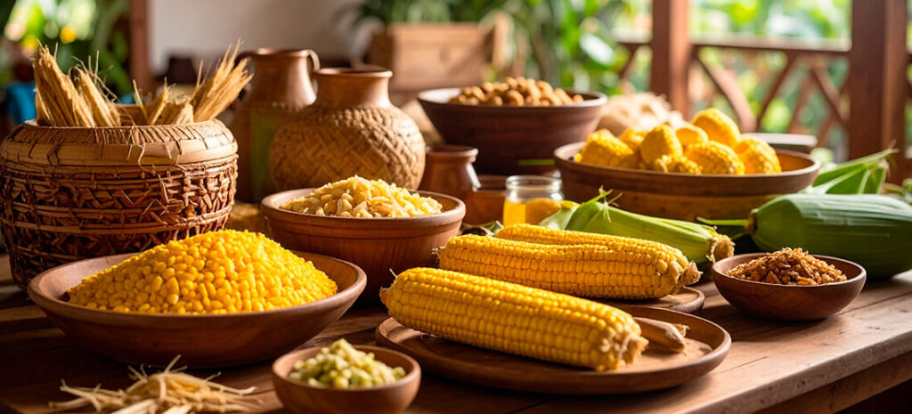 - Doces: Canjica, pamonha, curau, pé-de-moleque, paçoca, bolo de fubá, bolo de milho, arroz doce, maçã do amor, cocada.