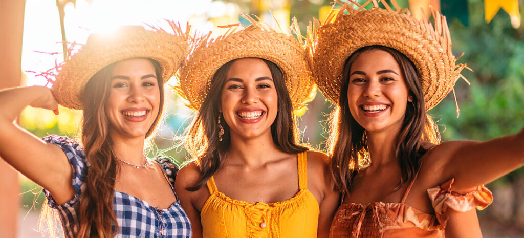 Incentive os convidados e, principalmente, sua equipe a entrarem no clima com trajes típicos: vestidos de chita rodados, camisas xadrez, chapéus de palha, tranças no cabelo, bigodes e barbas pintadas. Esses detalhes enriquecem a experiência visual e torna tudo mais divertido.